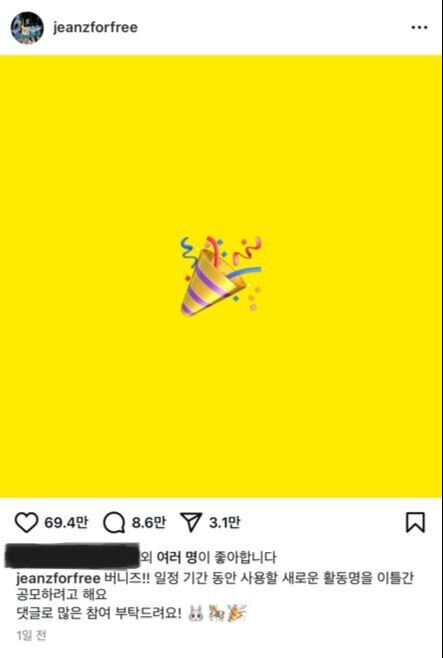 뉴진스 멤버들은 23일 인스타그램 ‘진즈포프리(@jeanzforfree)’ 계정을 통해 “일정 기간 사용할 새로운 활동명을 이틀간 공모하려고 한다”며 “댓글로 많은 참여를 부탁드린다”고 말했다.