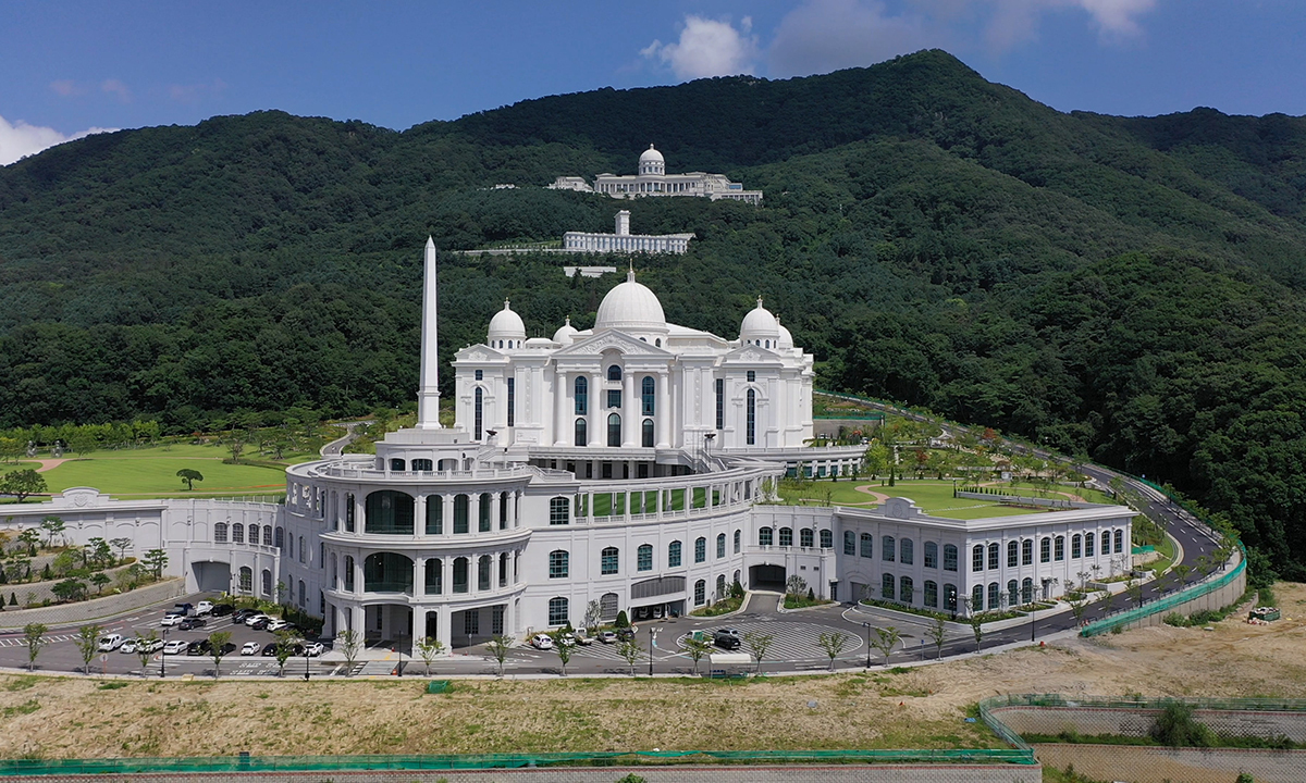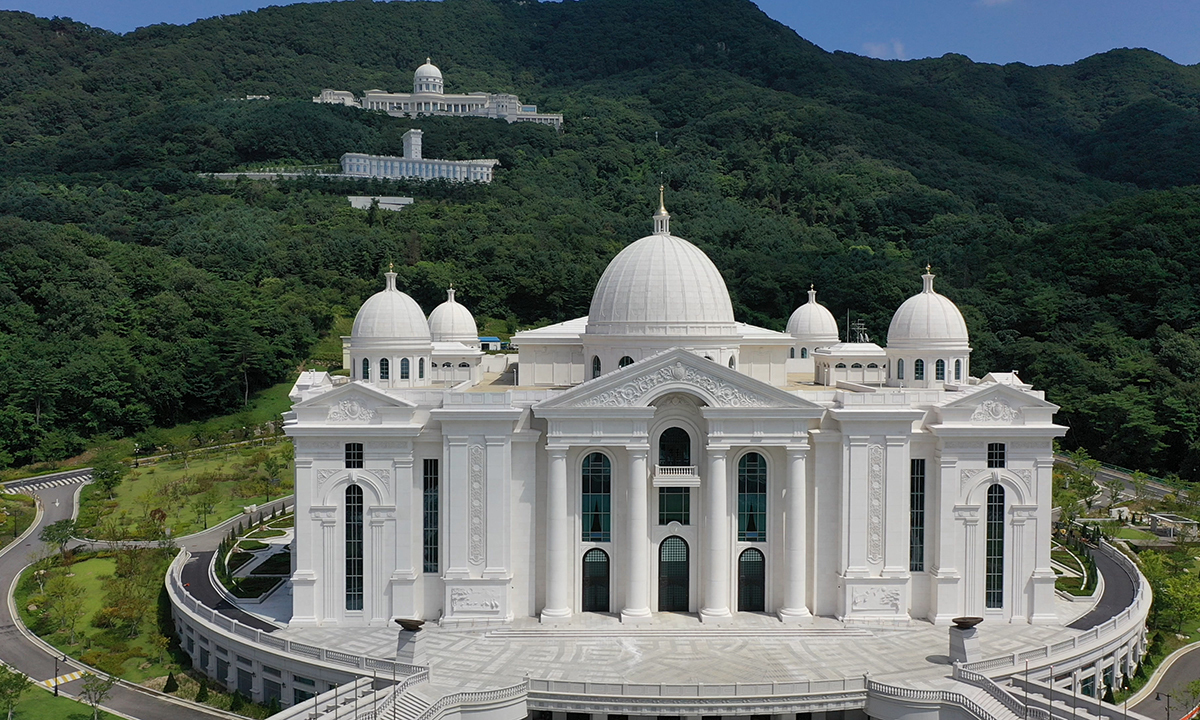 경기도 가평군 설악면 송산리 천성산(장락산) 자락에는 두 개의 흰색 돔형 건축물이 보인다. 청평호를 바라보는 이 건물은 천정궁(天正宮,위)과 올해 완공된 천원궁(天苑宮)이다. 이들 건축물은 세계평화통일가정연합이 하늘부모님이 거하시는 성전으로 건립했는데, 로마 바티칸 교황청처럼 박물관 기능도 갖추고 있다. 송산리 일대 2644만㎡ 부지에는 청소년수련원, 종합체육관, 국제병원, 신학대학원, 중·고교, 사무빌딩, 실버타운, 교회 등 가정연합 관련 시설이 들어서 ‘천원 단지’ 또는 ‘통일교 타운’으로 불린다.