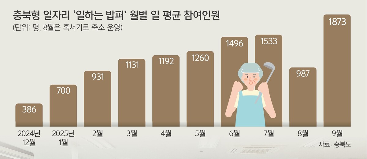 이 사업은 지난해 3월 청주시 탑리경로당에서 시작해 두 달 뒤 ‘시니어 자원봉사단’ 발대식에서 업무협약으로 확대됐다. 이어 지난해 7월 ‘일하는 밥퍼’라는 용어를 처음 사용했다. 당시 재원은 민간단체 주도 기부금을 활용했다. 도는 올해를 ‘일하는 밥퍼 원년의 해’로 정하고 기본계획 수립, 시행지침 제정, 범도민운동, 추진위원회 구성, 조례 제정, 운영사업단 지정 등을 통해 본격적인 사업 시행에 돌입했다. 지난 4월 세계 3대 광고제로 꼽히는 ‘2025 뉴욕페스티벌 대한민국 국가브랜드 대상’ 시상식에서 도시브랜드 복지정책 부문을 수상했다.