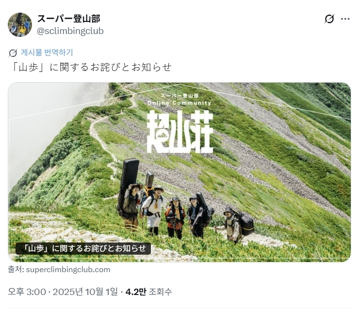고(故) 김광석의 노래 ‘바람이 불어오는 곳’과의 유사성 논란에 휘말린 일본 인디 밴드 ‘슈퍼등산부(ス-パ-登山部)’가 해당 음원의 철회를 알렸다.
