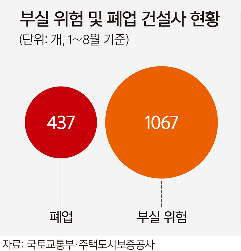 2일 국토교통부 건설산업지식정보시스템(KISCON)에 따르면 올해 1~8월 종합건설사 437곳이 폐업한 것으로 집계됐다. 지난해 같은 기간 대비 10.4% 늘어난 수치다. 주택도시보증공사(HUG) 상시 모니터링에서도 부실 위험 단계에 해당하는 업체가 1067곳으로, 전체의 38.9%에 달했다.