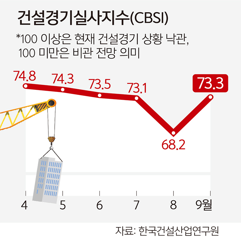 건설업 침체는 지표로도 드러난다. 한국건설산업연구원(건산연)에 따르면 9월 건설기업 경기실사지수(CBSI)는 73.3을 기록했다. 8월보다 5.1포인트 올랐지만, 지난해 9월과 비교하면 2.3포인트 떨어졌다. 이 지수가 기준선인 100을 밑돌면 현재 건설 경기 상황을 비관적으로 보는 기업이 더 많다는 것을 의미한다.