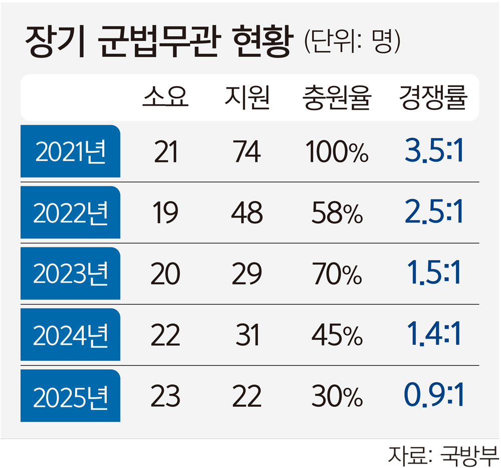 단기 군법무관도 불안한 흐름을 보이긴 마찬가지다. 2021년과 2022년 경쟁률은 1.1:1로 가까스로 정원을 맞췄지만, 2025년에는 0.72:1까지 급락하며 충원에 실패했다.
