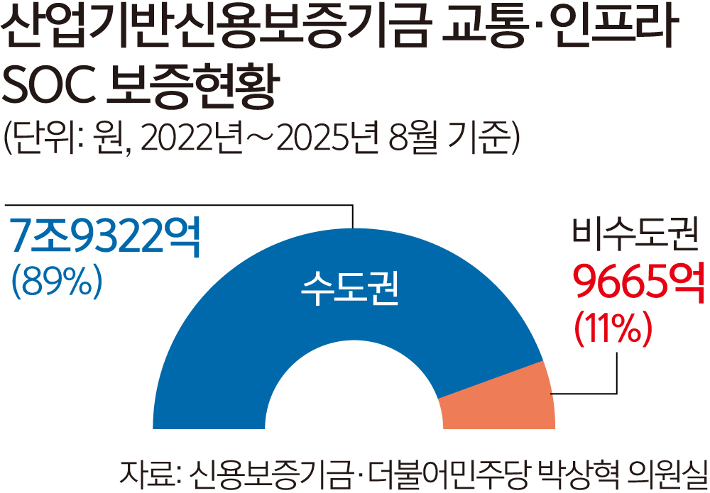 사회기반시설(SOC) 확충 목적의 민간투자사업에 원활한 자금 조달을 지원하기 위해 ‘공적기금’으로 마련된 산업기반신용보증기금(산업신보기금)의 교통·인프라 SOC 사업 보증액 약 90%가 서울 등 수도권에 집중된 것으로 나타났다. 이재명정부가 ‘지역균형발전’ 과제를 국가 생존전략으로 꼽은 만큼, 비수도권 교통·인프라망 확충에 적극적인 정부 지원이 이뤄져야 한다는 지적이 이어진다.