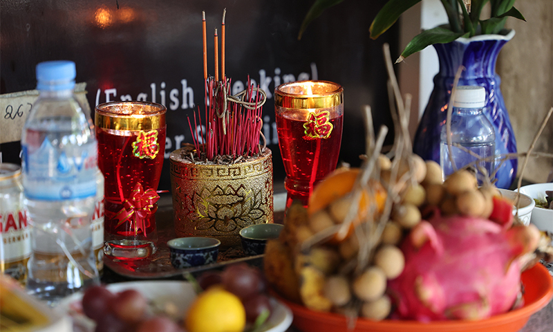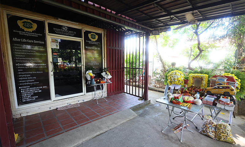 영정 사진이 놓인 탁자에는 과일뿐만 아니라 가짜 달러와 종이로 만든 집 모양의 장난감도 놓였다. 다음 생애에는 부자로 환생해 잘 살라는 의미라고 현지인은 설명했다.