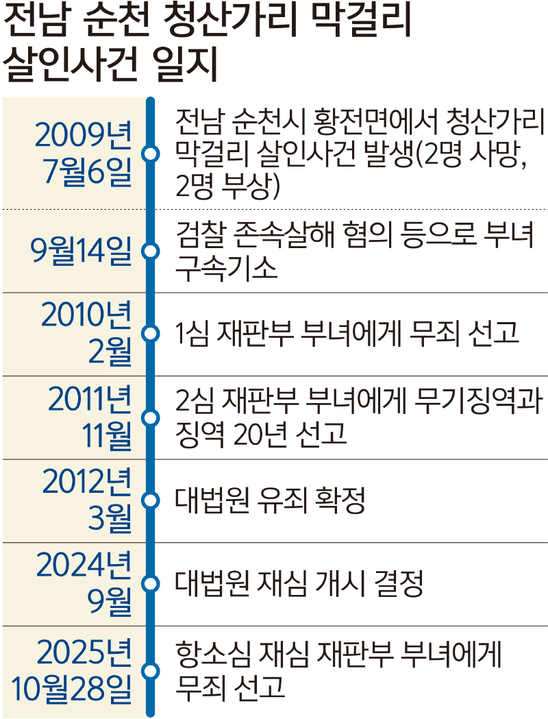 광주고법 형사2부(재판장 이의영 고법판사)는 이날 살인 및 존속살인 등 혐의로 기소된 백씨와 딸의 항소심 재심에서 피고인들에게 각각 무기징역과 징역 20년을 선고했던 원심을 파기하고 무죄를 선고했다. 청산가리 막걸리 살인 사건은 2009년 7월6일 전남 순천시의 한 마을에서 독극물인 청산가리가 섞인 줄 모르고 막걸리를 나눠 마신 주민 4명 중 2명이 숨지고 2명이 다친 사건이다. 범인으로 지목된 백씨 부녀는 숨진 피해자 가운데 1명인 최모씨의 남편과 친딸이다.