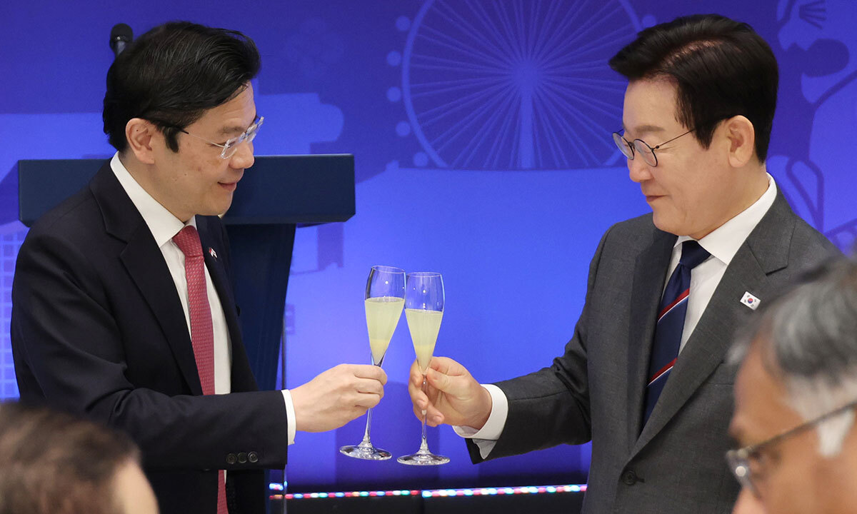 이재명 대통령은 2일 로런스 웡 싱가포르 총리와 정상회담에서 "각각 동북아시아와 동남아시아에서 첨단산업과 혁신을 주도하는 양국이 그야말로 반짝반짝 빛나는 전략적 동반자 관계를 만들어가면 좋겠다"고 말했다.