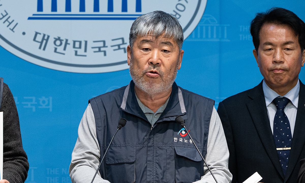 김동명 한국노동조합총연맹 위원장이 5일 서울 여의도 국회 소통관에서 법정 정년연장 연내 입법 촉구 양대노총 기자회견을 하고 있다. 뉴스1