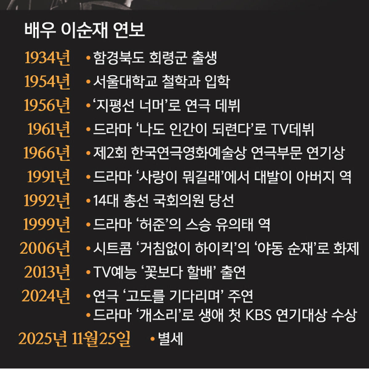 25일 유족에 따르면 이순재는 이날 새벽 향년 91세의 나이로 별세했다.