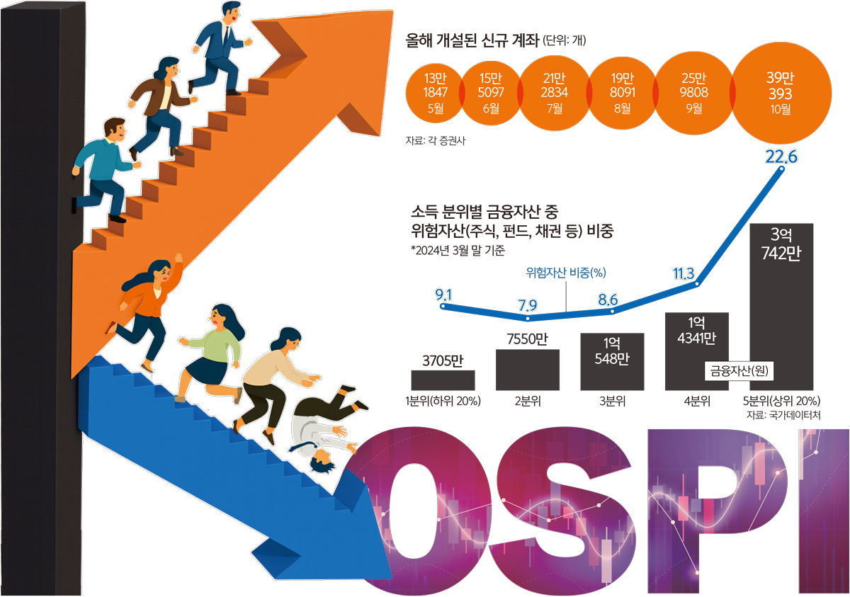 ‘K자 양극화’에 대한 우려도 나온다. 주식 투자에서 손실을 본 다수가 저소득층일 것으로 추정되기 때문이다. 국가데이터처가 지난해 발표한 ‘가계금융복지조사’에 따르면 2024년 3월 말 기준 5분위(소득 상위 20%) 가구의 위 금융자산 중 주식, 펀드, 채권 등 위험자산(투자자산) 비중은 22%(평균 6933만원) 이상인 반면 1분위 가구의 투자자산 비중은 약 9%(평균 338만원)에 불과하다. 고위험 투자 경험이 풍부한 고소득층의 경우 코스피 상승 국면 초기부터 주식을 보유했을 확률이 높고 그 규모도 상대적으로 월등한 반면 저소득층의 경우 코스피 진입 시기가 늦었을 가능성이 높다는 의미다.