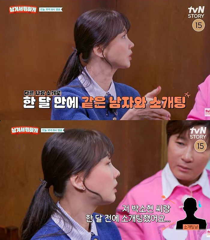 박소현은 소개팅을 했는데 같은 사람과 한 달 간격으로 또다시 소개팅을 했다고 밝혀 놀라움을 안겼다. 서로 다른 경로로 소개팅을 받게 됐는데 두 번째 만남에서 박소현이 “처음 뵙겠습니다”라고 인사하자 상대방은 입을 꾹 다물고 말을 안 하더란다. 이에 의아했던 박소현은 나중에 주선자를 통해 상황을 듣고 나서야 자신의 실수를 알게 됐다고.