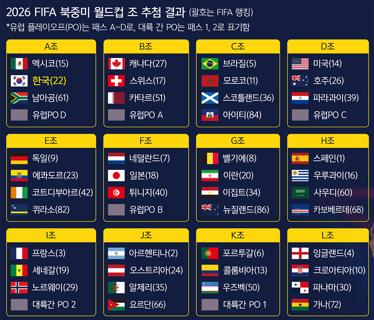 게다가 포트3에서 FIFA 랭킹이 가장 낮은 남아공(61위)을 만나는 점도 긍정적 요소다. 다만 어떤 유럽 팀을 만나게 될지는 PO가 열리는 내년 3월이 돼야 알 수 있다는 점은 변수다. 유럽 PO 4개 패스 중 이탈리아가 속한 패스A를 피한 게 ‘불행 중 다행’이다.