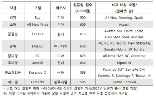차급별로는 기아 레이가 경차에서 가장 우수한 성적을 거뒀고 소형차는 기아 프라이드, 준중형은 현대 i30 GD, 중형은 한국지엠 말리부, 준대형은 기아 K7, 초대형은 현대 제네시스, 중소형 SUV는 쌍용 코란도C, 미니밴은 한국지엠 올란도가 차지했다.