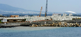 | 5일 제주해군기지 건설을 둘러싸고 수년째 이어져 온 서귀포 강정마을 주민과 국방부의 법정 분쟁에서 대법원이 국방부 손을 들어줘 제주해군기지 건설이 계획대로 진행될 법적 근거가 마련됐다. 사진은 제주해군기지 건설공사가 진행되고 있는 서귀포 강정마을 앞바다. 세계일보자료사진 |