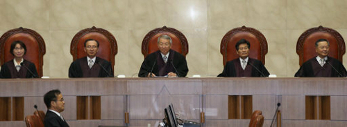 | 대법원 전원합의체(주심 민일영 대법관)는 5일 강정마을 주민들이 국방부 장관을 상대로 낸 제주해군기지 사업실시계획 승인처분 무효확인 소송 상고심에서 원심의 피고 패소 부분을 파기하고 사건을 서울고법으로 돌려보냈다. 사진은 이날 열린 전원합의체의 재판 모습. 연합뉴스 |