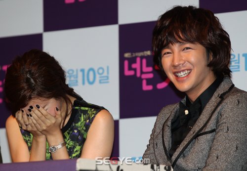 2일 오후 서울 롯데시네마 건대입구점에서 열린 영화 '너는 펫'(감독 김병곤) 언론시사회에 참석한 배우 김하늘, 장근석이 밝은 표정을 짓고 있다.