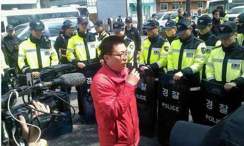 | ▶ 진보신당 비례대표 정진우 후보가 청와대 경비 경찰에 둘러싸여 선거유세를 하고 있다. 경찰은 진보신당의 유세가 불법집회라고 판단해 해산 명령을 내렸다. /사진=진보신당 트위터 |