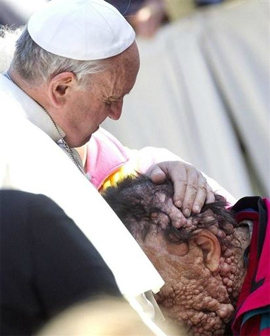 | 프란치스코 교황이 피부 질환을 앓고 있는 환자를 포옹하고 있다. |