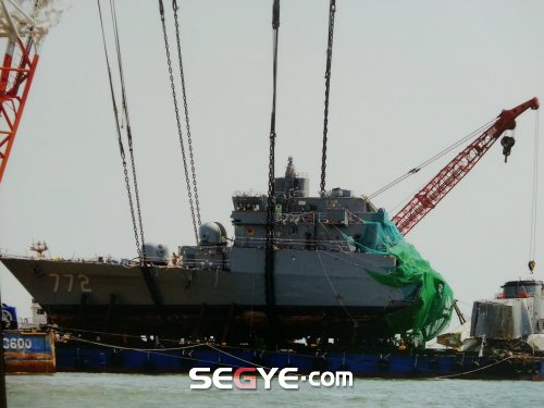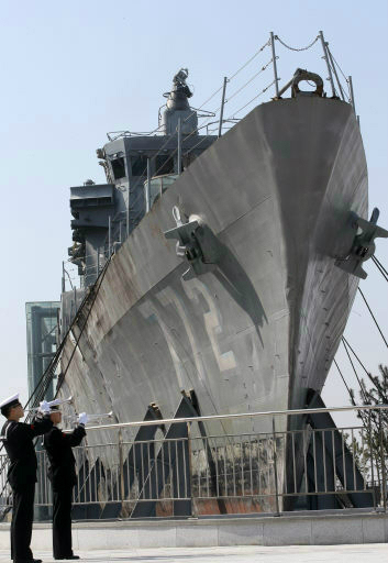 | 천안함 사건 5주년을 일주일 앞둔 19일 오전 경기도 평택 해군 제2함대 사령부에 전시된 피격 천안함 앞에서 해군 장병이 천안함 46용사를 위한 진혼곡을 연주하고 있다. |