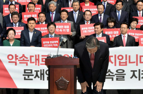| 새누리당 김무성 대표(앞)가 23일 국회 본청 앞 계단에서 열린 공무원연금개혁을 촉구하는 결의대회에서 고개를 숙이고 인사하고 있다. 김 대표는 대회에서 공무원연금개혁 대국민 호소문을 발표했다. 이재문 기자 |