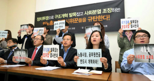 | 시민단체연합 회원들이 23일 서울 정동 프란치스코회관에서 민노총-공무원노조 총파업 규탄 시민사회단체 긴급기자회견을 열고 있다. 이들은 불법파업에 반대한다는 주장을 냈다. 연합뉴스 |