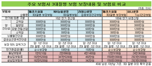 29일 보험업계에 따르면 가입할 수 있는 3대질병 집중 보장성 보험은 NH농협생명 '하나로NH3대질병보험', 라이나생명 '집중보장건강보험', 하나생명의 '행복KnowhowTop3건강보험', 메리츠화재의 '3대질병보험' 등이다.