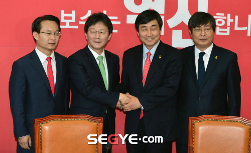 | 새누리당(왼쪽부터) 조해진 원내수석부대표, 유승민 원내대표와 새정치민주연합 이종걸 원내대표, 이춘석 원내수석부대표가 10일 국회 새누리당 원내대표실에서 열린 상견례에서 악수를 나누고 있다. 이재문기자 |