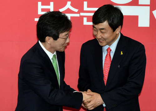 | 새누리당 유승민(왼쪽), 새정치민주연합 이종걸 원내대표가 10일 국회 새누리당 원내대표실에서 5월 임시국회 의사일정과 관련한 첫 회동을 갖고 악수하고 있다. 이재문 기자 |