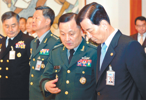 | 대화 나누는 이순진 합참과 한민구 국방 한민구 국방부 장관(오른쪽)과 이순진 합참의장이 29일 청와대에서 열린 군 장성 진급 및 보직신고에서 대화를 나누고 있다. 오른쪽부터 한 장관, 이 합참의장, 장준규 육군참모총장, 정호섭 해군참모총장. 서상배 선임기자 |