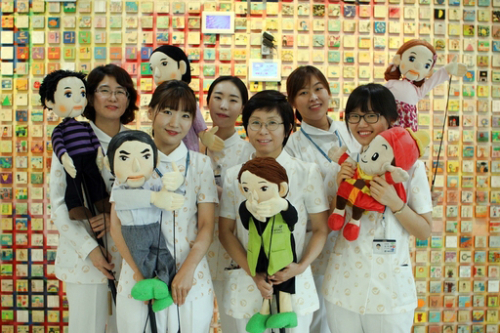 | 지난 13일 서울아산병원 인형극 봉사단 간호사들이 서울아산병원 어린이병원에서 인형극에 사용되는 인형을 들고 기념촬영을 하고 있다. 굿네이버스 제공 |