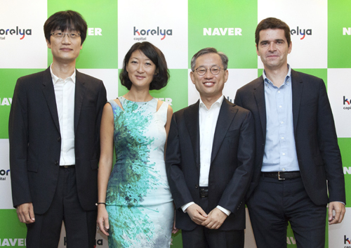 | 30일 서울 웨스틴조선호텔에서 열린 코렐리아 캐피탈의 펀드 출범 기자회견에서 이해진 네이버 의장(왼쪽부터)과 플뢰르 펠르랭 프랑스 전 디지털 경제장관, 김상헌 네이버 대표, 앙투완 드레쉬 코렐리아 캐피탈 공동대표가 기념촬영을 하고 있다. 네이버 제공 |
