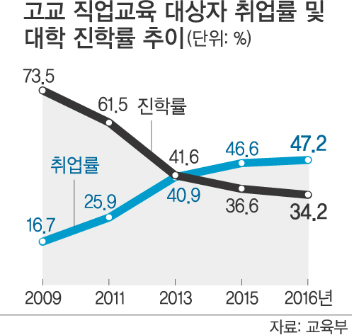 반면, 특성화고 졸업생의 대학 진학률은 2009년 73.5%에서 지속적으로 떨어져 올해 34.2%를 기록했다.