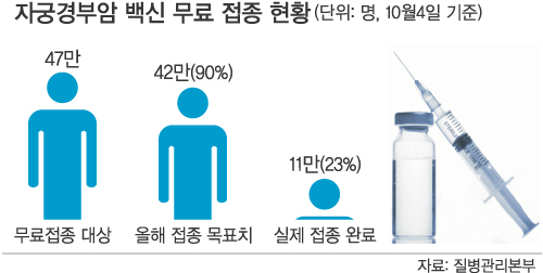 질병관리본부는 자궁경부암 백신 무료접종 대상자 47만5000명 중 이달 4일 현재 접종 완료자는 11만3000명으로 집계됐다고 13일 밝혔다. 접종 완료 비율은 24.3%로, 호주나 미국의 접종률 90%에 한참 못 미치는 수치다.
