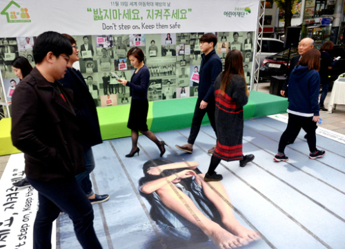 | 우리의 소중한 아동 지켜주세요 14일 서울 무교동 초록우산어린이재단 앞의 도로를 오가는 시민들이 “밟지 말고 지켜주세요”라고 적힌 현수막과 길에 그려진 그림을 살펴보고 있다. 재단은 오는 19일 ‘세계 아동학대 예방의 날’을 앞두고 캠페인에 나섰다. 서상배 선임기자 |