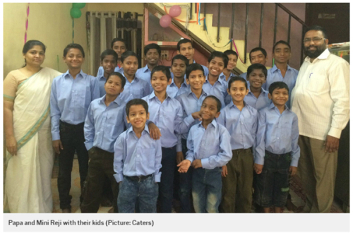 지난 12일(현지시간) 영국 메트로 등 외신들에 따르면 인도 마하라슈트라주 뭄바이에 사는 라집 토마스(44)는 아내 미니 레지와 두 아이 외 22명의 아이들을 보살핀다. 덕분에 토마스는 '파파 레지(Papa Reji)'라는 별명이 붙었다.