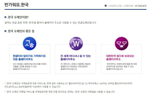 | 한국인터넷진흥원의 한글 도메인 안내 페이지. 한국인터넷진흥원 홈페이지 캡처. |