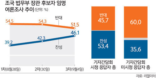 이날 발표된 리얼미터 여론조사(오마이뉴스 의뢰·3일 전국 성인 501명 조사·95% 신뢰수준에 표본오차 ±4.4%포인트)에서는 조 후보자 임명에 반대한다는 응답은 지난달 30일 조사에 비해 2.8%포인트 감소해 51.5%, 찬성한다는 응답은 3.8%포인트 증가해 46.1%인 것으로 나타났다.