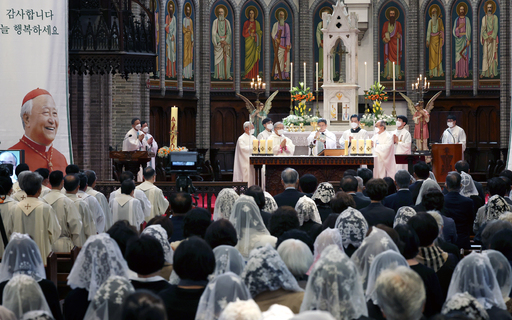서울 명동성당에서 27일 천주교 서울대교구장 정순택 대주교 주례로 정진석 추기경 선종 1주기 추모 미사가 거행되고 있다. 2006년 김수환 추기경에 이어 우리나라 두 번째 추기경으로 임명된 후 서울대교구장을 지낸 정 추기경은 지난해 27일 오후 10시 15분 90세로 선종했다. 오는 30일에는 정 추기경이 잠든 경기 용인시 성직자 묘역에서 추모 미사가 열린다.