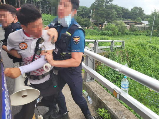 문재인 전 대통령 사저 앞에서 1인 시위를 하다 흉기로 협박한 혐의로 남성 A씨가 체포됐다.