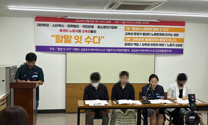 민주노총 공공운수노조 더불어사는희망연대본부는 8일 서울 중구 프란치스코교육회관에서 대한항공·스타벅스·마켓컬리·국민은행·중소벤처기업부를 원청으로 둔 전·현직 콜센터 근로자들의 증언대회를 열었다. 이들은 콜센터 업체들이 정식 입사 전 최저임금에 미달하는 임금을 당당하게 지급하는 현실을 고발하며, 이런 관행이 개선돼야 한다고 주장했다.
