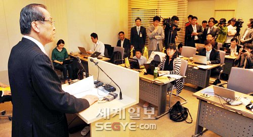 | ◇신영철 대법관의 ‘촛불 재판 개입’ 사건과 관련해 대법원 공직자윤리위원회 마지막 회의가 열린 8일 오전 서울 서초동 대법원 회견실에서 최송화 위원장이 최종 결론을 발표하고 있다. 전신 인턴기자 |