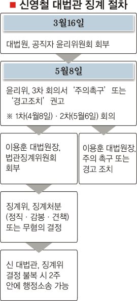 ◆신 대법관의 거취는?=신 대법관을 징계위원회에 회부할지 여부는 이 대법원장의 ‘의중’에 달려 있다. 그렇더라도 외부인사가 포함된 윤리위가 ‘징계위원회에 회부할 사안은 아니다’는 취지로 결정한 만큼 이 대법원장이 굳이 징계위를 소집하는 방안을 선택할 리 없다. 대법원 관계자도 “윤리위 결정은 신 대법관을 징계위에 넘기지 말라는 취지로 보인다”고 해석했다.