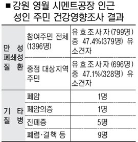 강원도 영월 시멘트공장 인근 지역의 성인들 중 절반 가량이 호흡기계 질병인 만성폐쇄성질환(COPD)을 앓고 있는 것으로 조사됐다.