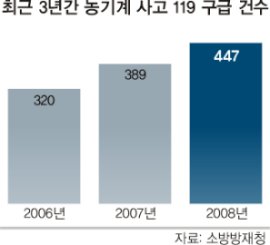 ◆기계화한 농촌, 위협받는 농민=소방방재청 재난관리정보센터 데이터베이스에 따르면 농기계 안전사고는 2006년 320건에서 2007년 389건, 2008년 447건으로 3년 만에 약 40% 증가했다. 안전사고의 절반가량은 모내기철인 4, 5월과 수확철인 9, 10월 등 농번기에 집중적으로 나타났다. 2006년에는 농번기 4개월 동안 전체 사고의 절반이 넘는 163건(50.9%)이 발생했다. 2008년에는 221건(49.4%), 2007년 178건(45.7%)이 농번기에 일어났다.