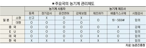 우리나라와 달리 미국·일본·유럽 등에서는 트랙터를 비롯한 농기계를 도로운행 차량으로 간주해 등록제를 실시하고 있다. 게다가 운전면허, 보험제도, 배출가스 규제 등과 연계해 다양한 안전장치가 마련된 상태다.