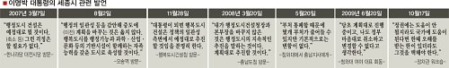 그간 세종시에 대한 이 대통령의 공식 발언은 국정 책임자로서 불가피한 것으로, ‘속뜻’과 다르다는 얘기다. 이 대통령이 사석에서 “양심상 그 일(세종시법)을 그대로 하기는 어렵다”는 심정을 가끔 털어놨다는 참모들의 전언과 일맥상통하는 것이다. 사실상 서울시장 시절의 ‘반세종시’ 소신이 여전히 이어지고 있는 셈이다.