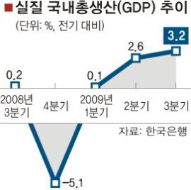 한국은행은 4일 ‘2009년 3분기 국민소득’(잠정)에서 올 3분기 실질 국내총생산(GDP) 성장률이 전기 대비 3.2%를 기록해 2002년 1분기(3.8%) 이후 7년6개월 만에 다시 3%대로 진입했다고 밝혔다. 이는 지난 10월26일 한은이 발표한 3분기 GDP 속보치보다 0.3%포인트 높아진 것이다.