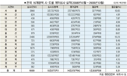 전국 지자체 발주 공사·용역·물품 건수는 2007년 15만4000여건에 15조1170여억원, 2008년에는 24만8000여건에 24조20여억원이었다.