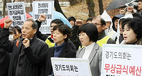 ◇경기도 시민·사회단체 회원들이 지난해 12월 경기도의회 앞에서 무상급식 예산을 전액 의결하라며 시위하고 있다.