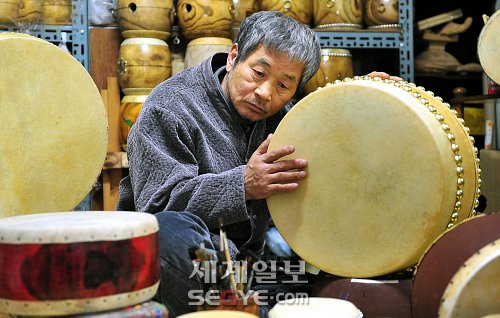 “기계로 하면 편하죠. 하지만 어느 부위의 가죽을 북에 쓰느냐에 따라 소리가 달라집니다. 또 가죽을 얼마나 당길지를 두고 세심하게 판단해야 합니다. 기계가 이런 걸 할 수는 없는 것 아닙니까.”